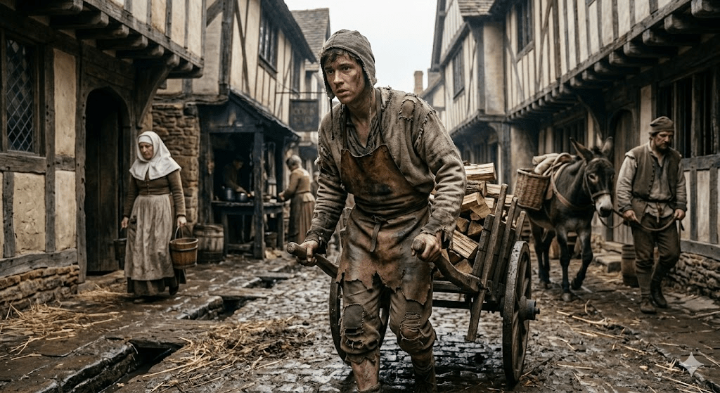 Morning light shines through the small windows of a Tudor workshop, catching dust that floats above a wooden bench. A boy works carefully beside his master, learning the craft that will shape his future. Across the courtyard, a young girl smooths linen and practises her curtsy, preparing for a life of service. In Tudor times, growing up meant learning duty – through work, manners, and faith – until childhood quietly gave way to adulthood.
