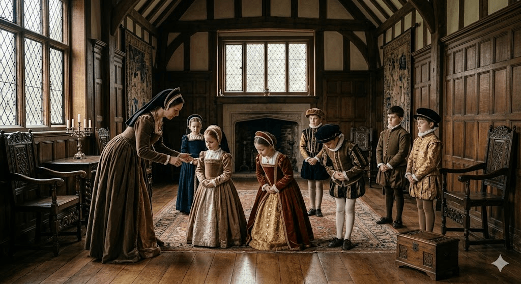 Good manners were highly valued in Tudor England. Noble children learned how to bow, dance, and speak politely, often practising in great halls or gardens. They were taught to show respect to elders and to move with grace, as every gesture reflected their family’s honour. In simpler homes, children learned kindness, honesty, and hard work – lessons that mattered just as much. Whether in a palace or a cottage, manners shaped how a young Tudor found their place in the world.